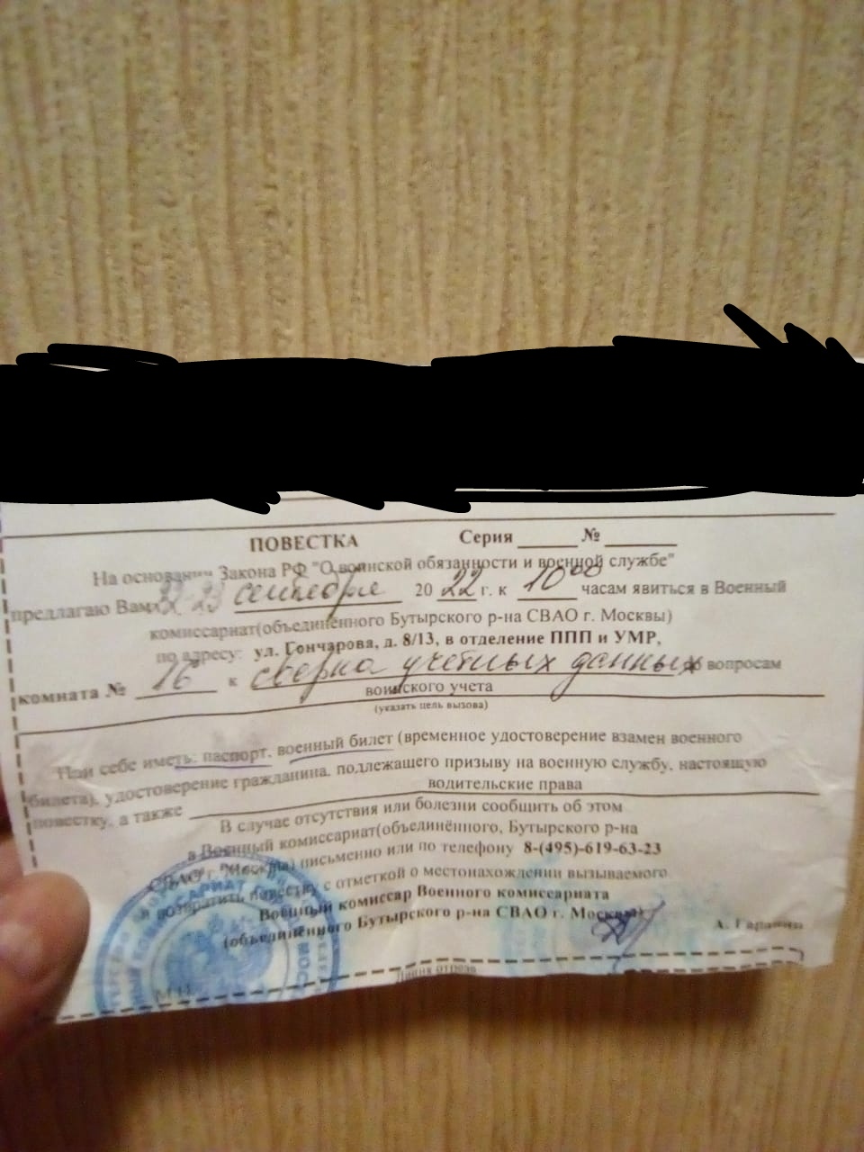 Приехал я туда, как и было указано двадцать третьего числа(сразу возник вопрос о том что в повестке было две даты что бы явиться). На входе стояли доблестные стражи порядка (и почему их сейчас не берут?....Ладно не буду разгонять эту тему). Придя в кабинет который был написан я, увидел кучу народа разного возраста. Нас начали спрашивать у кого есть основания на отсрочку(так как они у меня были я прошел в первых рядах). Но военкоме сказал что у меня не совсем правильно составлено письмо и что мол надо его переделать.
