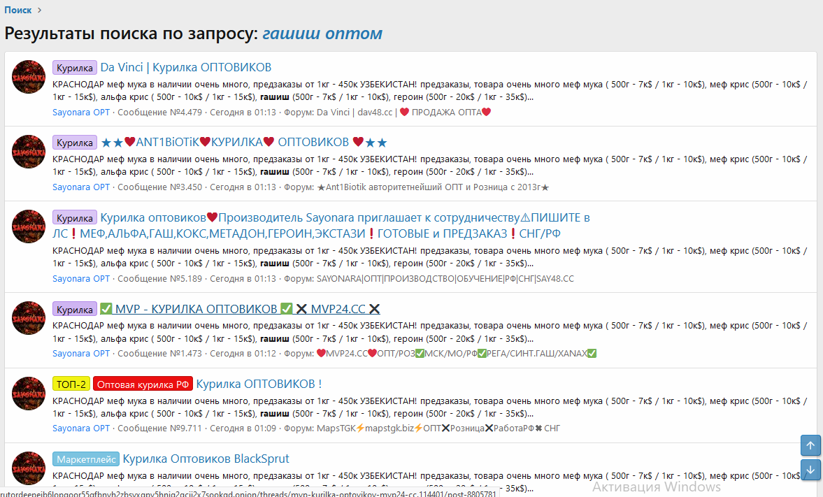 Может кому-то нравится на несколько шопов работать и ничего кроме спама не делать.Бля, думал об этом тоже. Ответ простой: чтобы показать работодателю, что работают. То же самое с курилками оптовиков. Знаешь, как я задолбался там по пять раз на дню спамить? А что делать, если другие так делают? И, в результате, если потенциальный клиент ищет, например, гашиш оптом, то видит только последние сообщения, вот так: