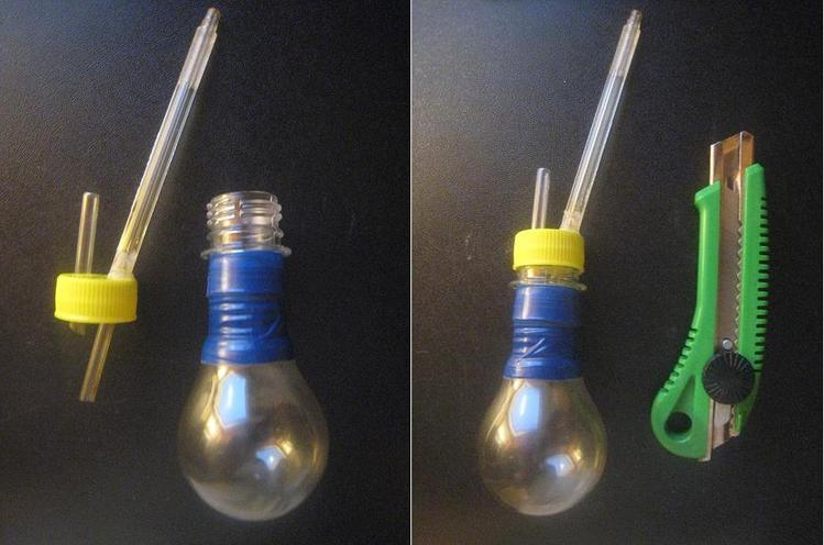 Если лампочка зафиксирована правильно, далее проводится модификация крышки. Именно через крышку вставляется трубка от шариковой ручки. Лучше сделать одно или несколько отверстий для лучшего обдува. Важно саму крышку и трубку надежно примотать к бутылке. Тут герметизация – это основная причина плохой работы самодельного вапорайзера.