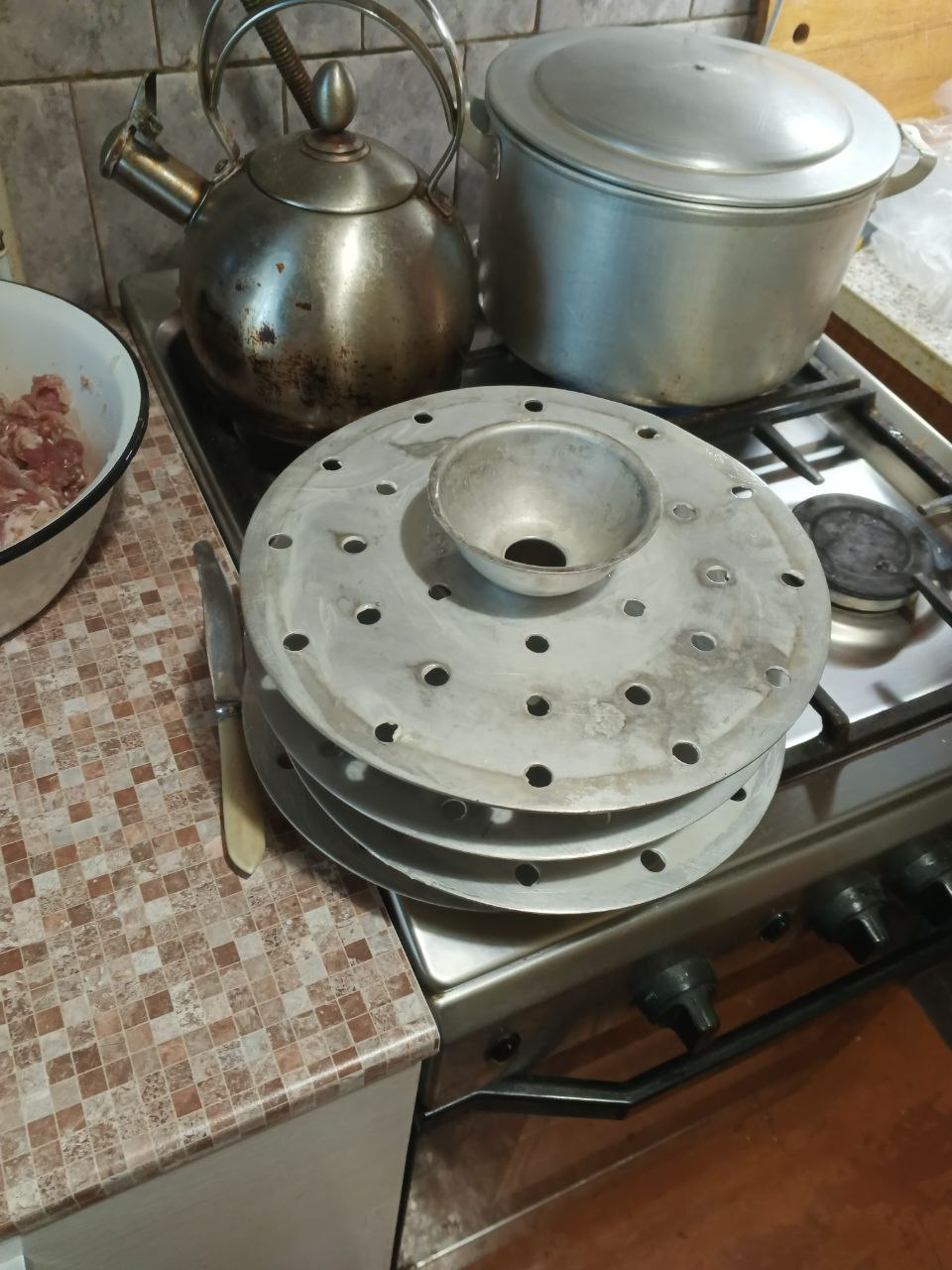 Теперь ставим мантышницу на огонь варим манты на пару 40 минут