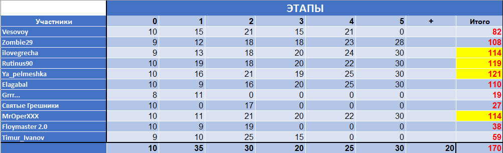 За каждый этап начисляются баллы, в т.ч за предварительный. Сводная таблица будет публиковаться здесь.
