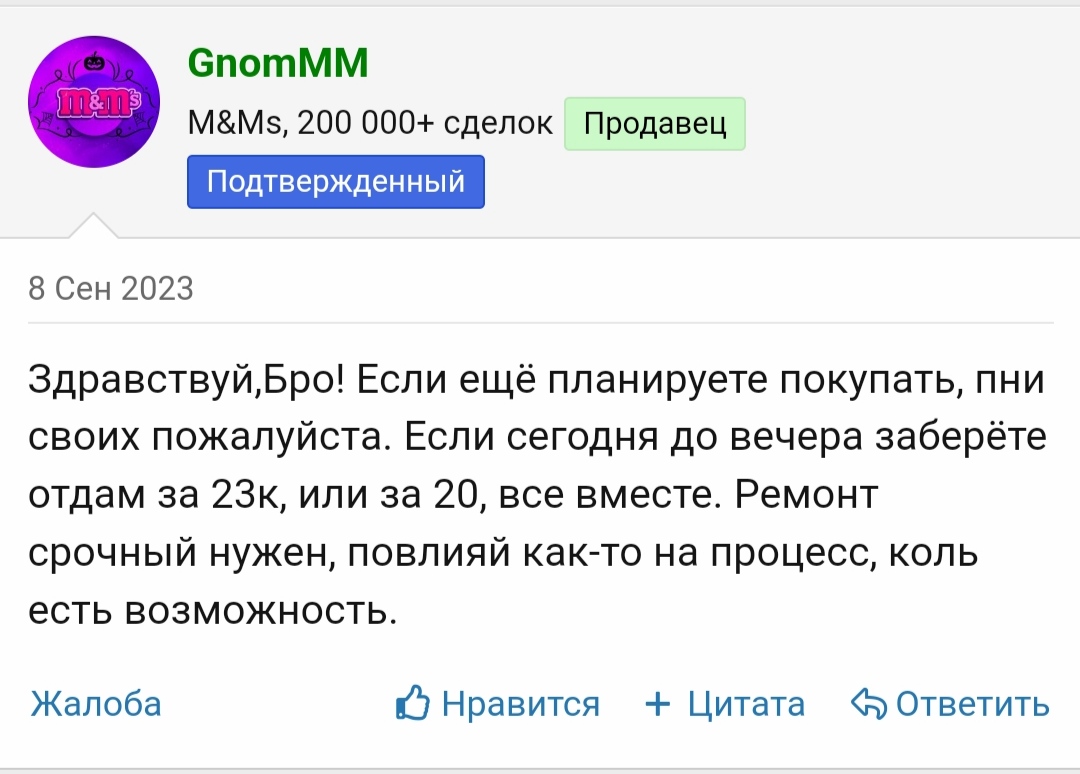Однако вот здесь не очень ясно к чему такая наглость. Стоимость материалов - 30к, оговорена изначально., это уже ниже рыночной цены за отлаженную связку, которая поедается всеми белыми РК/Источниками, кроме крупных СМИ. Работы должны были быть оплачены в зависимости от объёма - 5-10к. Из слов покупателя третьего числа - копейки. Итог сделка девятого, в условиях, когда я сделал баснословный уступок: "если сегодня до вечера заберёте отдам за 23к, или за 20, все вместе."