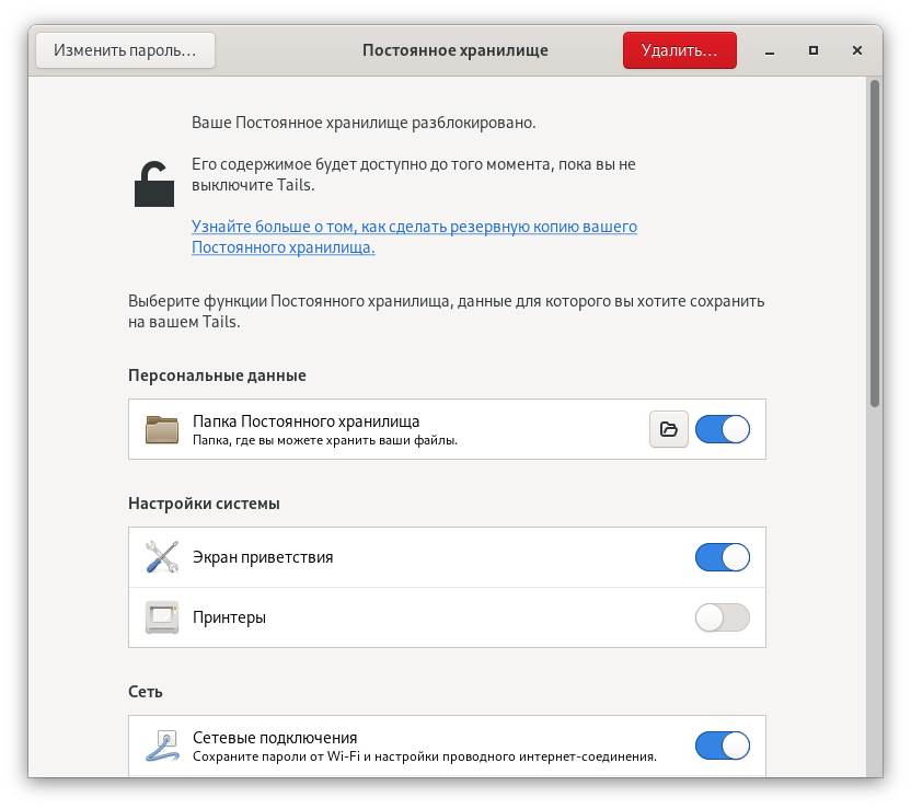 Зачем она нам? Всё просто. Дело в том, что эта операционная система по умолчанию удаляет чуть больше чем всё после каждого выключения или перезагрузки и перед нами каждый раз будет "чистый лист". Это имеет место быть в определённых случаях, но если за нами не охотятся, разумеется нам бы не хотелось каждый раз заново всё настраивать. Нам бы хотелось, чтобы были сохранены настройки, наши закладки, может какие-то документы.